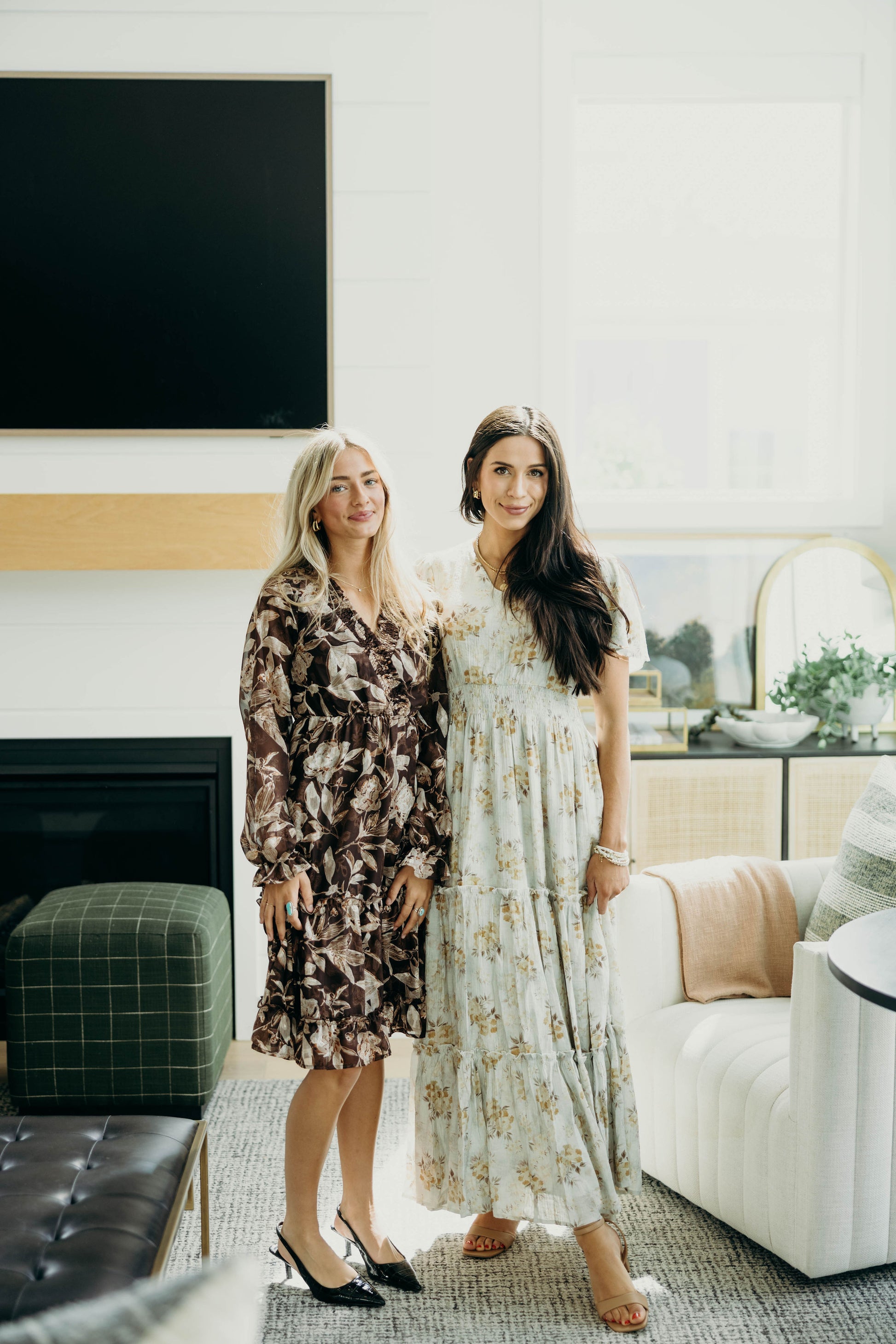 Knee length faux wrap dress with long sleeves, v neckline, tiered skirt and smocked detail.