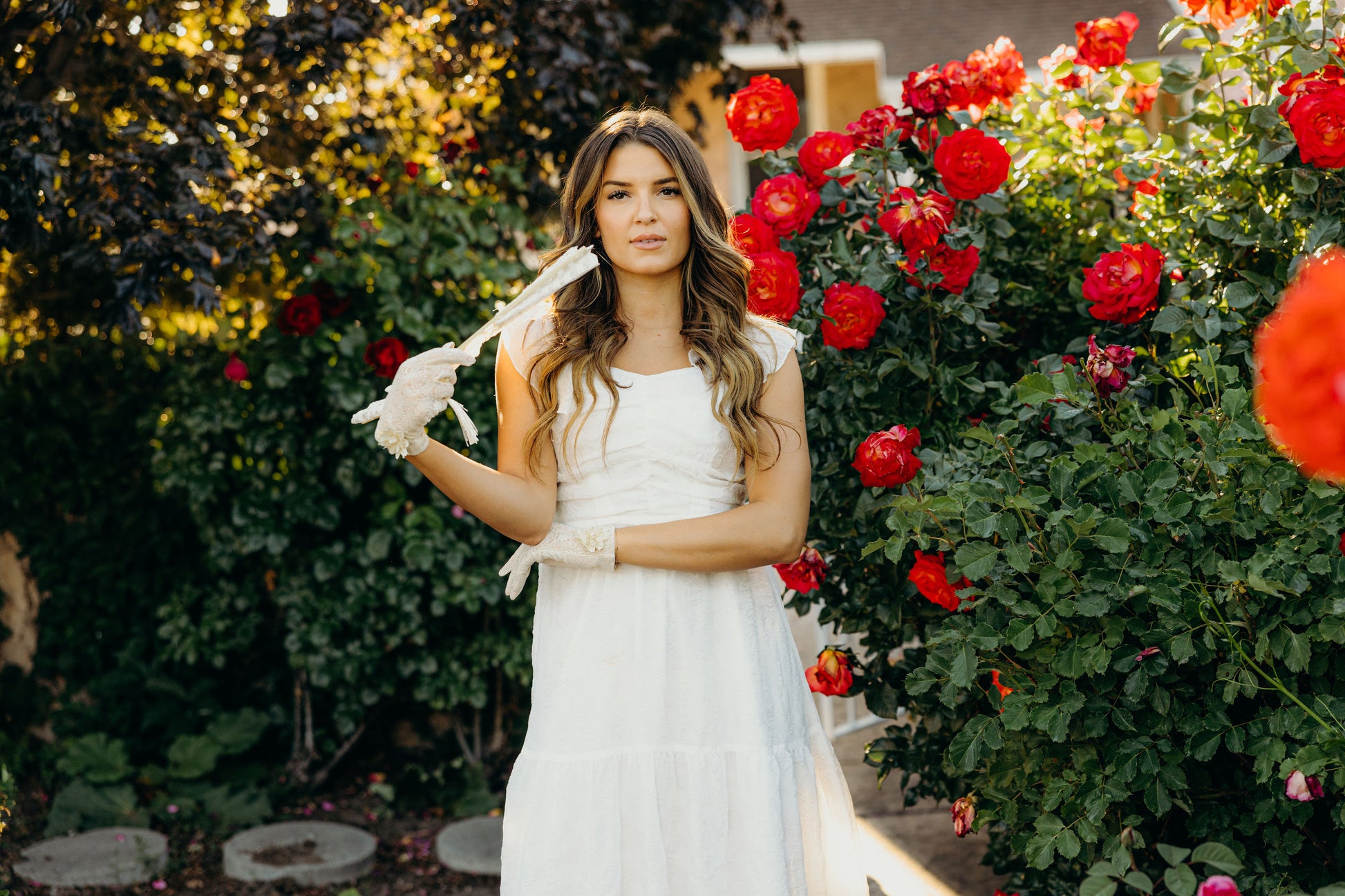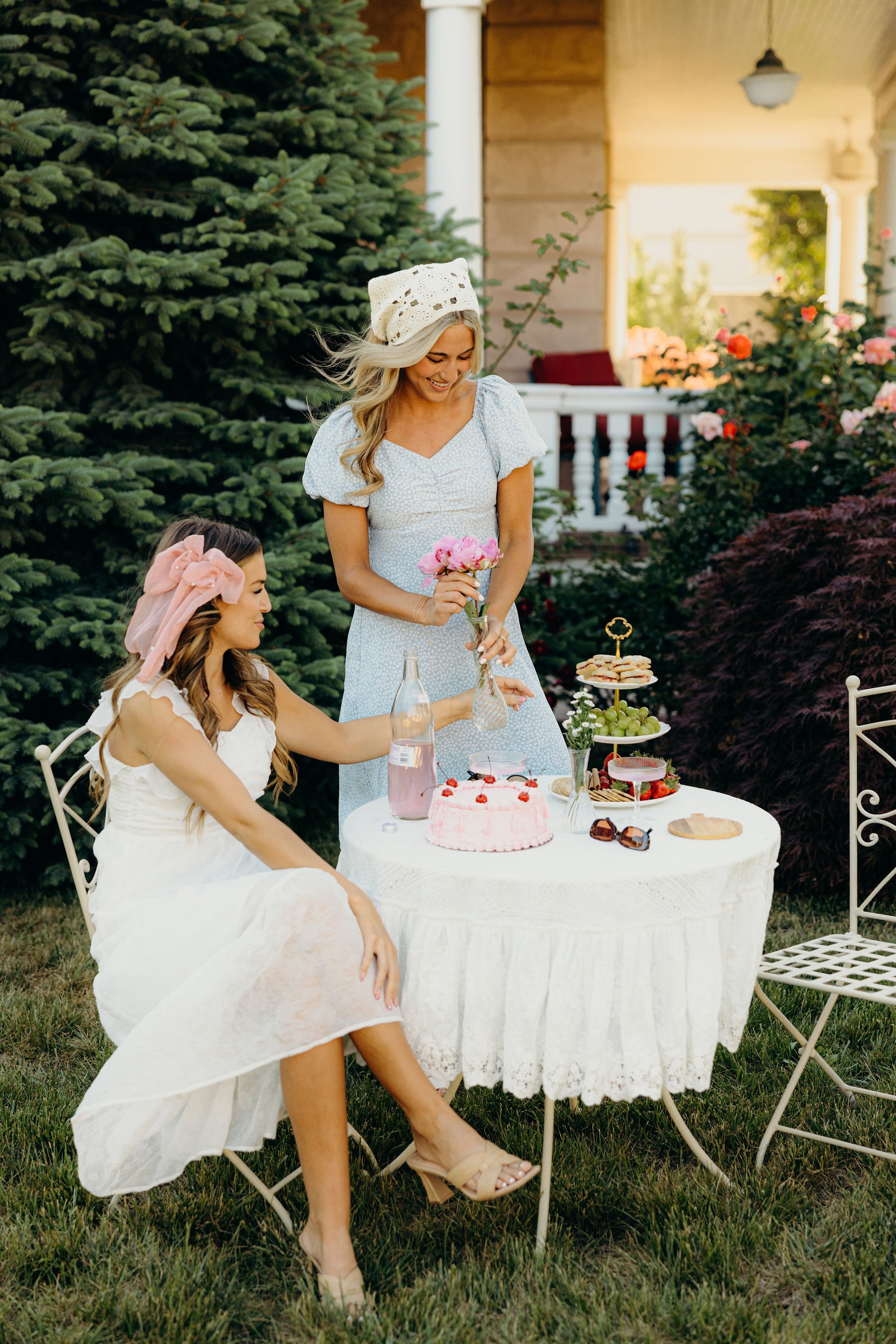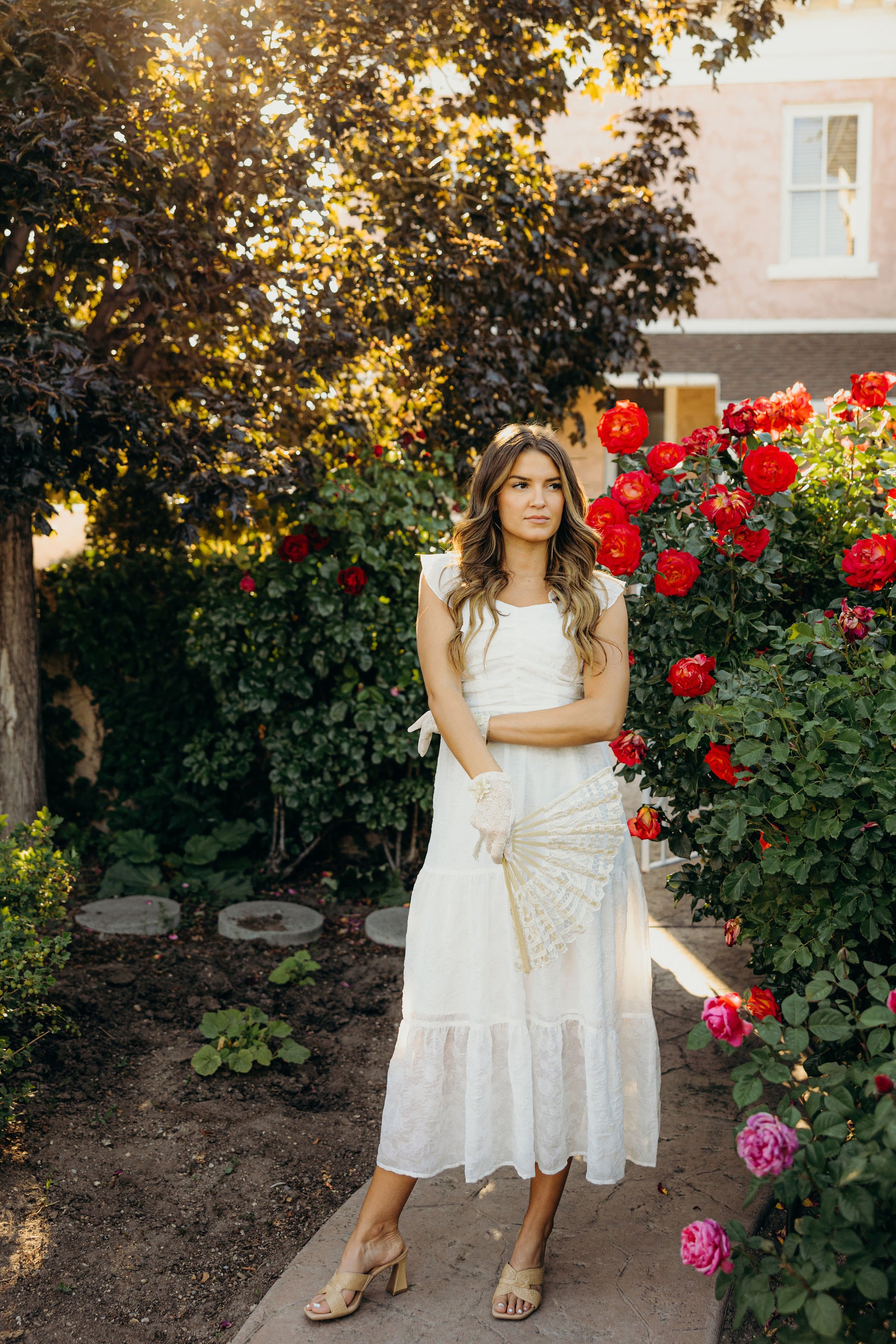 Tea-length dress with a tiered skirt, gathered bodice with sweetheart neckline, and flutter sleeves.