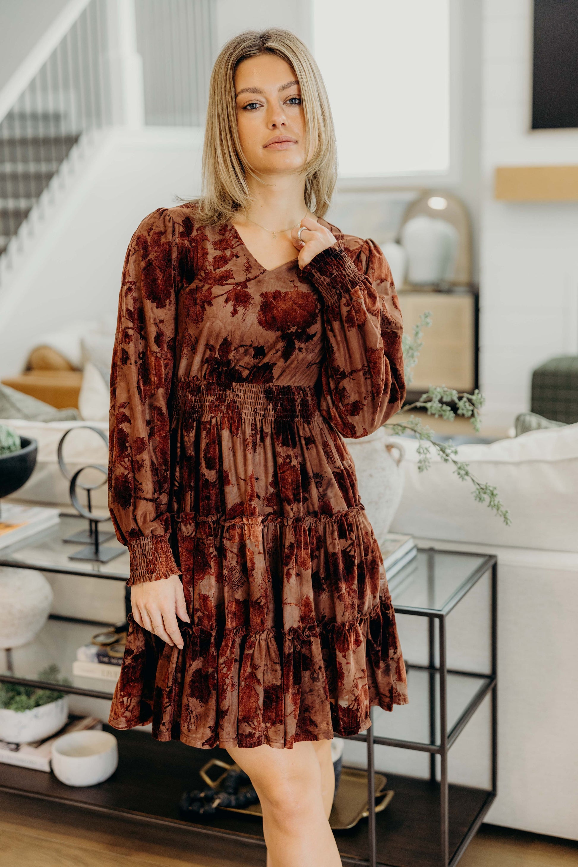 Knee length dress with tiered skirt, smocked waist, v neckline, and long sleeves.