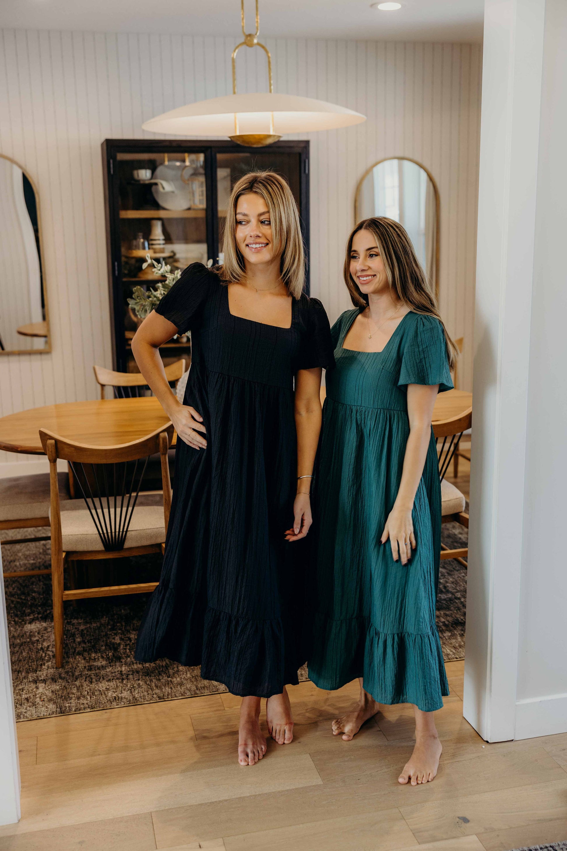 Mid-length dress with short flutter sleeve, and relaxed fit empire waist, and pockets.