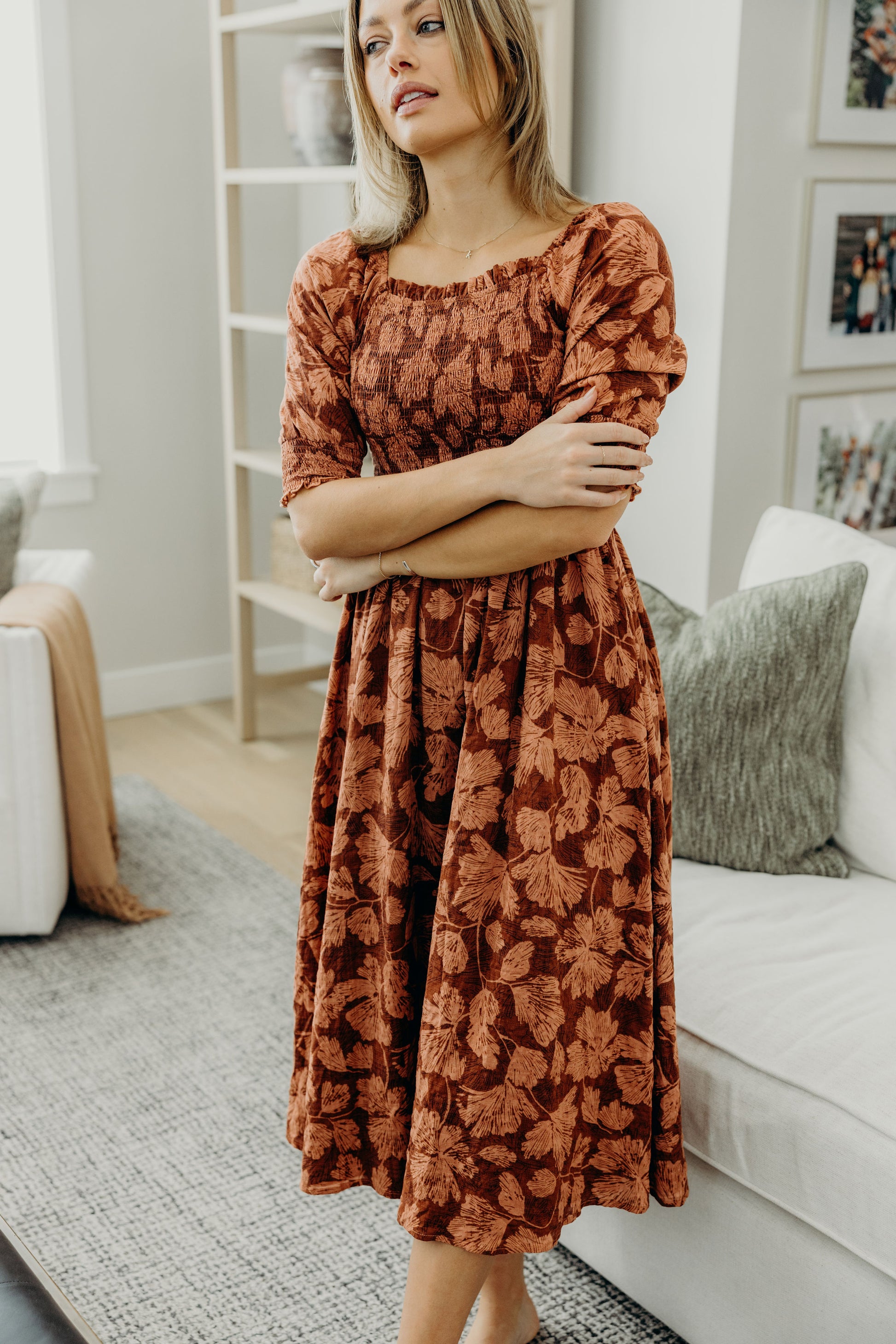 Mid-length skirt with a smocked bodice, a line silhouette, square neckline with ruffle detail, and half sleeve with elastic cuffs.