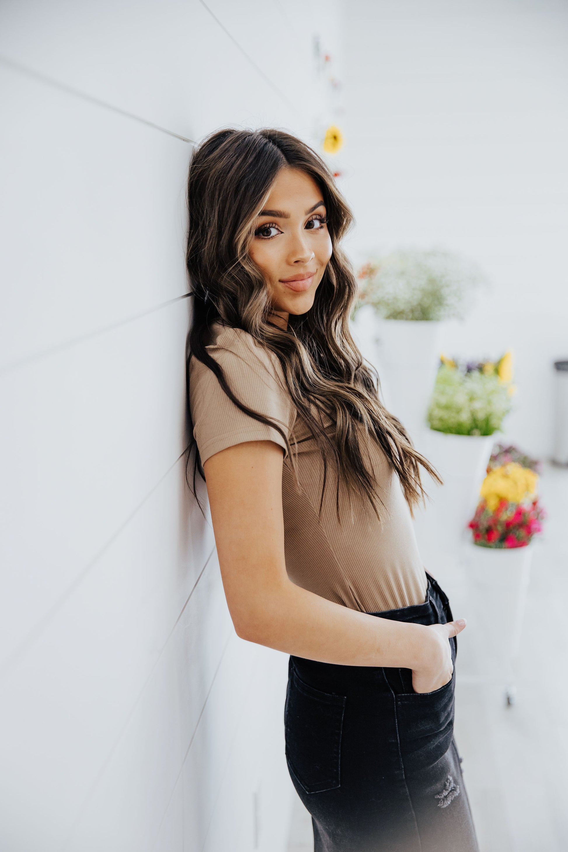 Ribbed tee with button detail and scoop neckline.